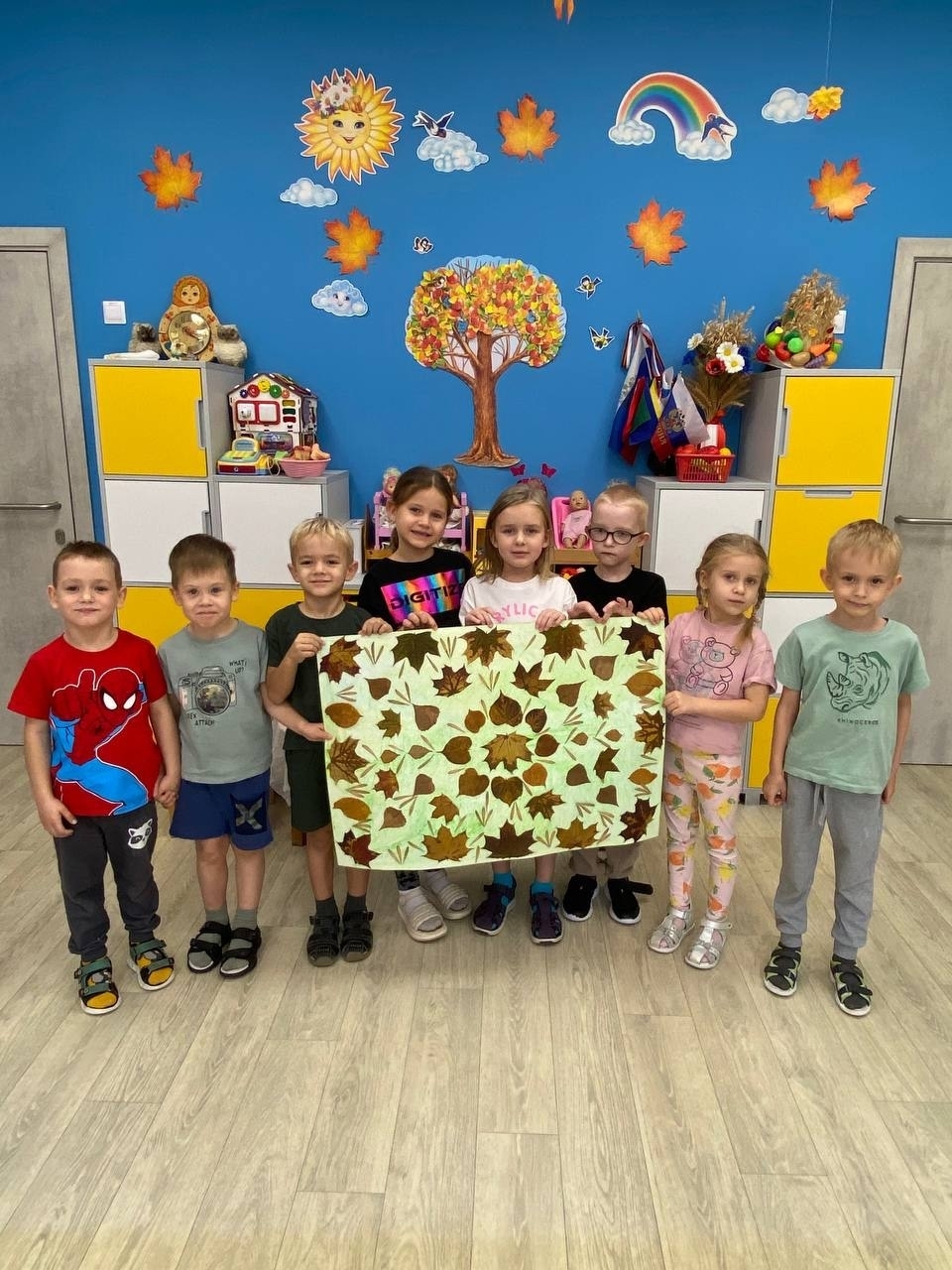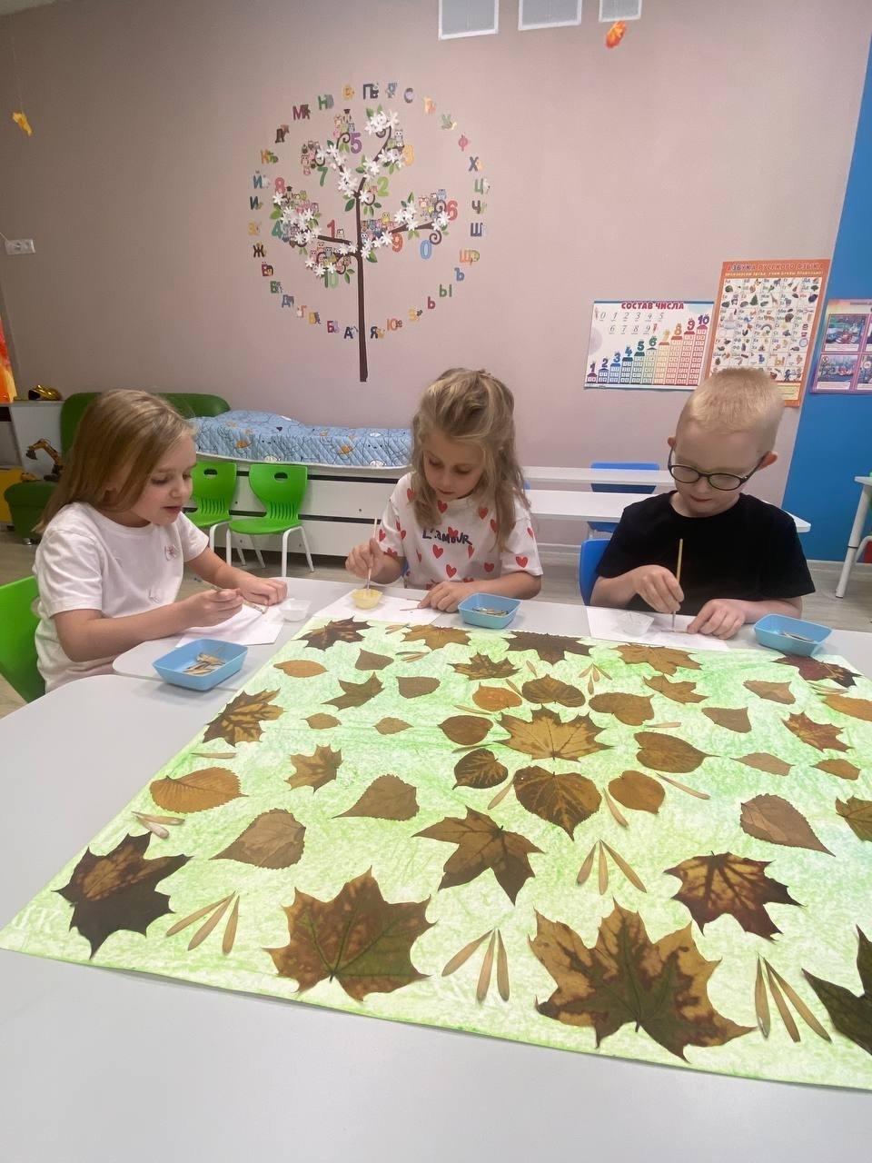 На прошлой неделе ребята старшей группы нашего детского сада на занятии по аппликации создали «Осенний ковёр», используя природные материалы — листья и семена деревьев.