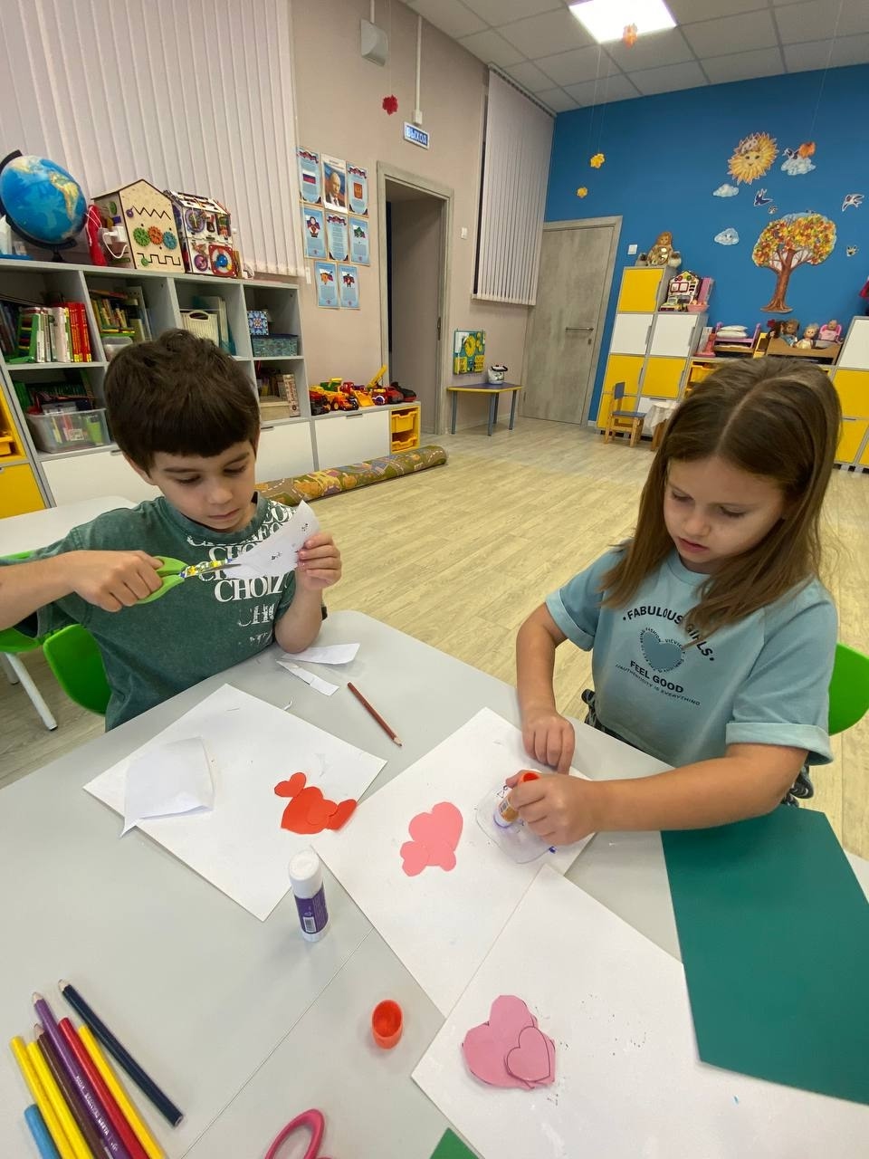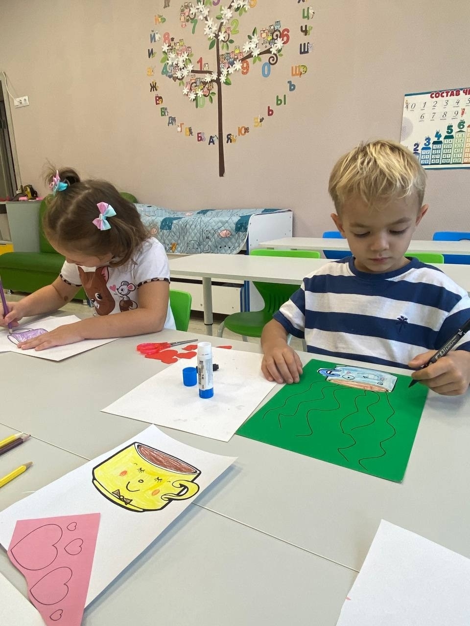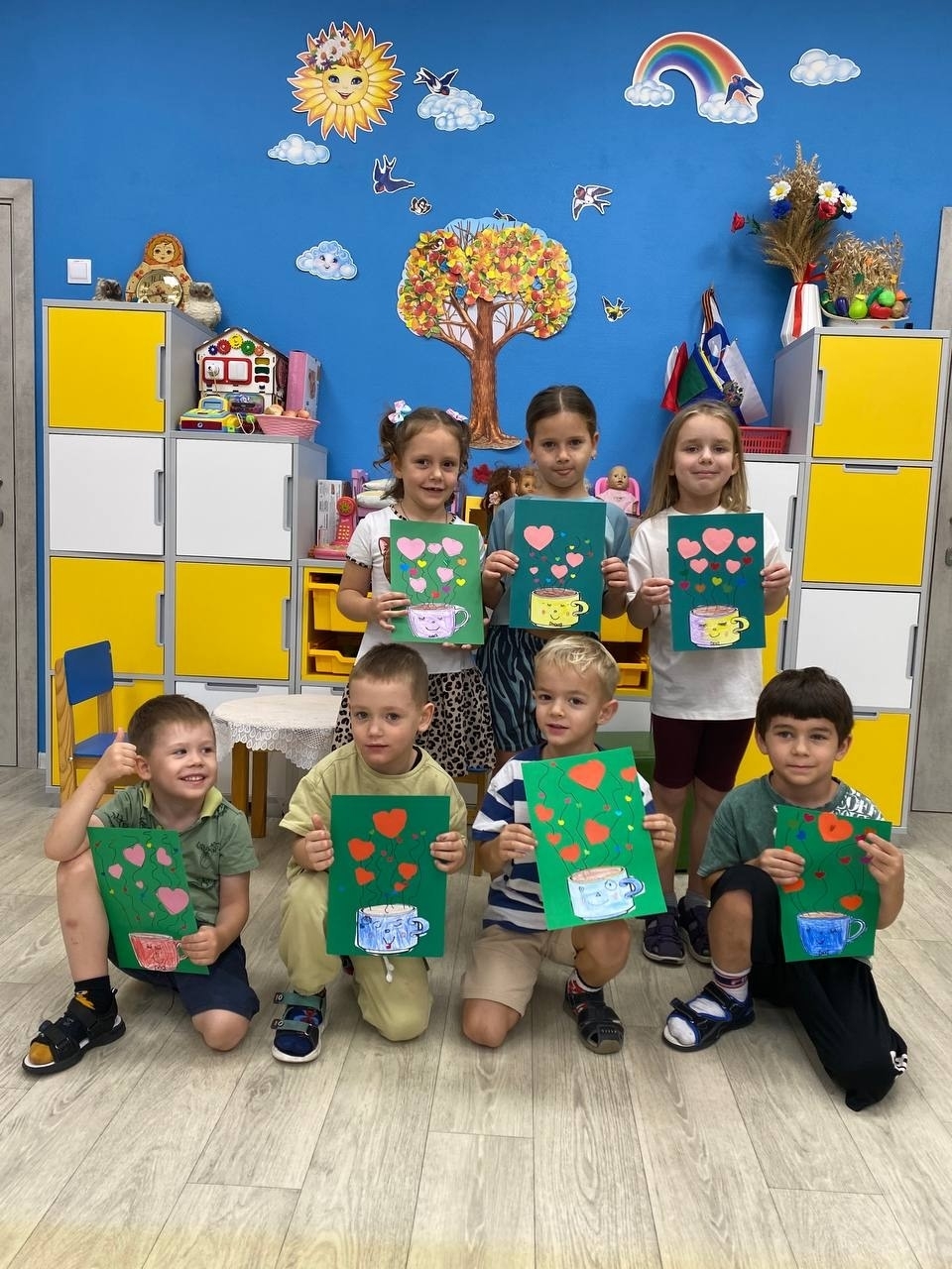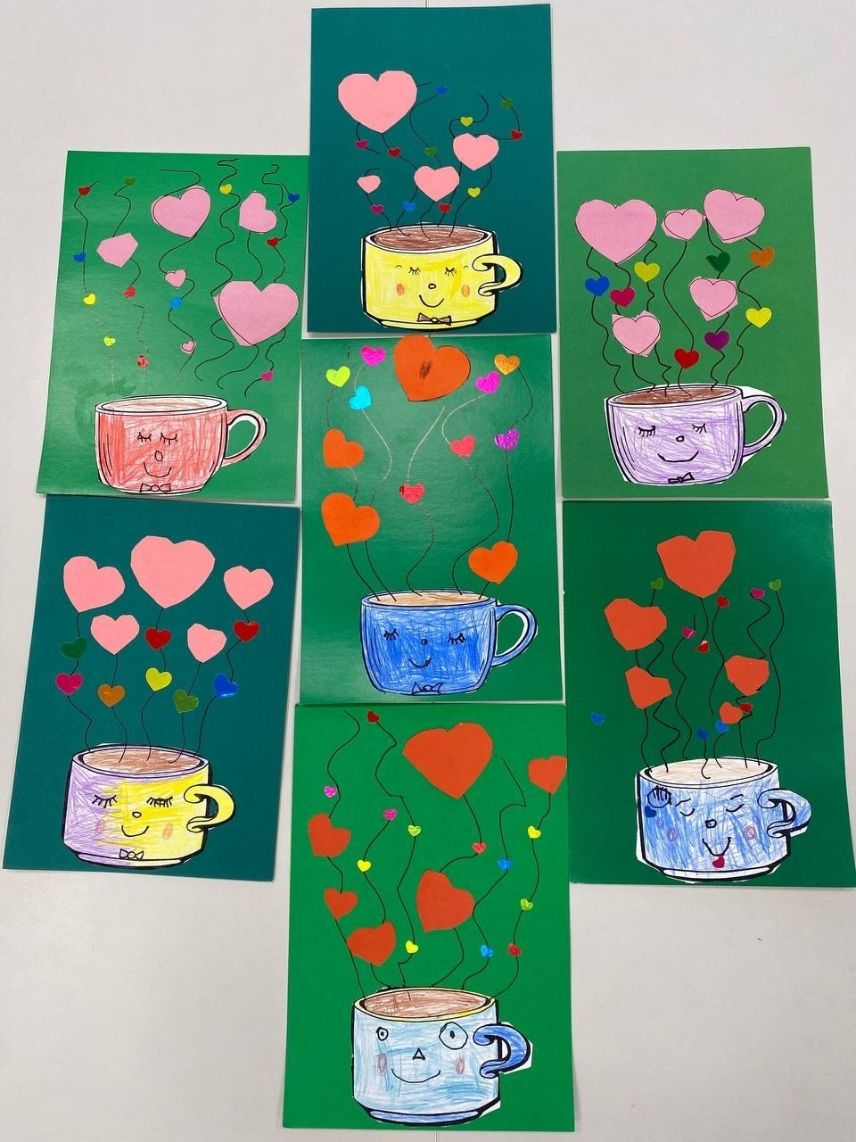 На занятии дети старшей группы сделали яркую аппликацию — кружку с горячим напитком, над паром которой расположились нежные сердечки.